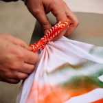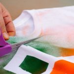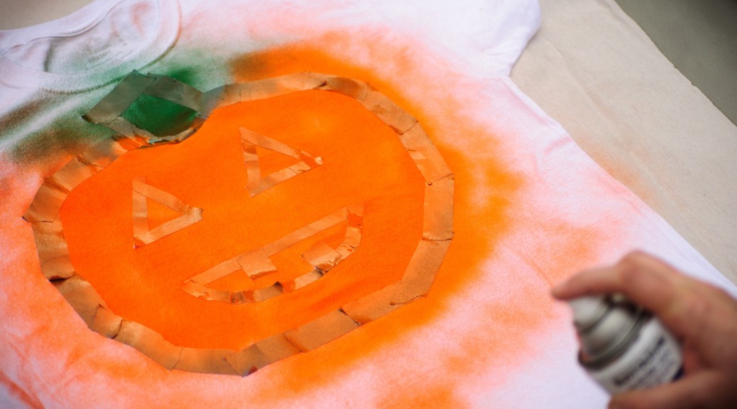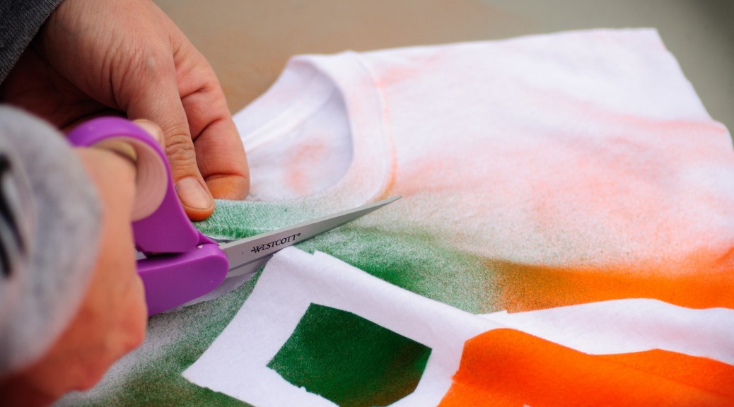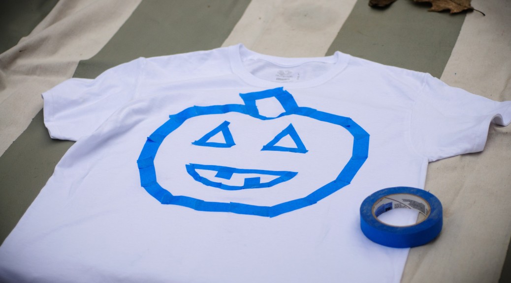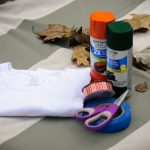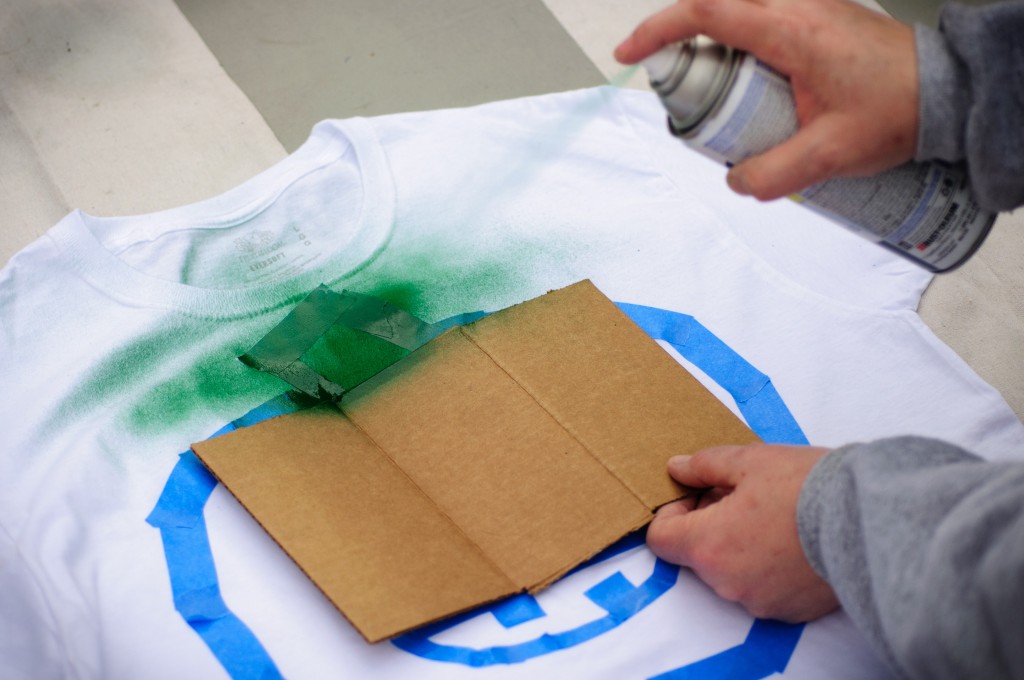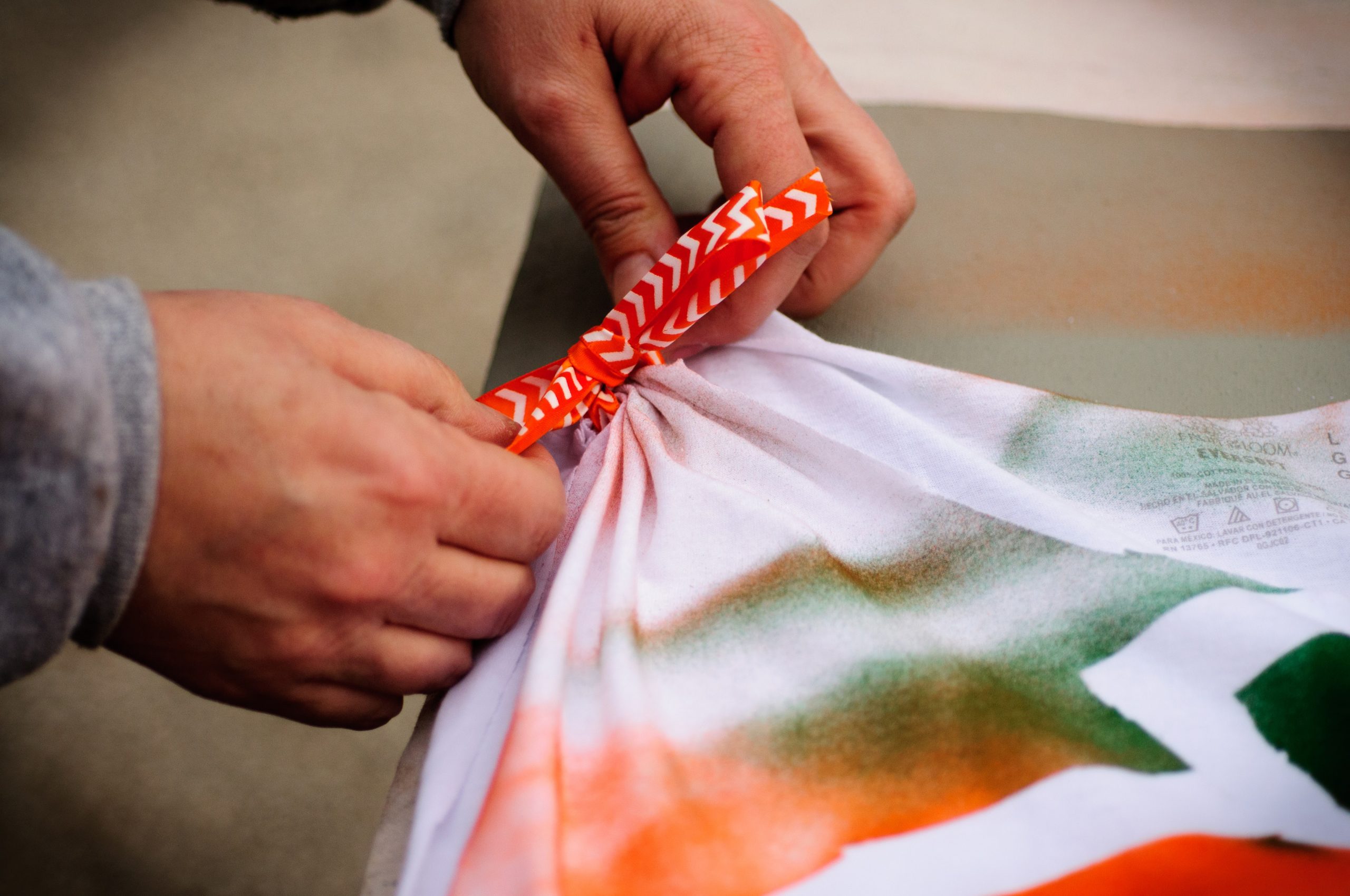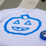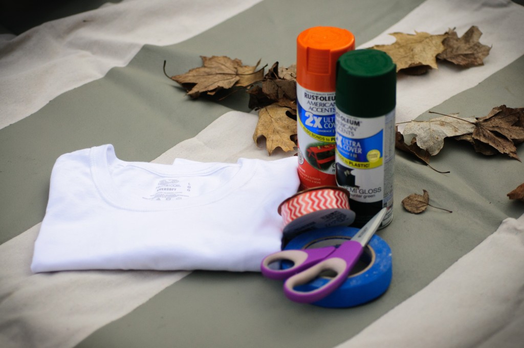 I usually buy multi-packs of men’s white t-shirts to share, but you could have people bring their own. Choose an area with lots of ventilation and a flat space to decorate the shirts on. Using masking tape, create a design on the t-shirt making sure to press the tape down firmly. Lay flat and take spray paint to highlight various areas of the design. Be sure to supervise and assist children with spray paint! Once dry (usually less than 30 minutes), remove tape and customize further. We like to cut and/or tie the t-shirt with ribbon to really make it your own. Matching t-shirts really make a group photo look amazing!